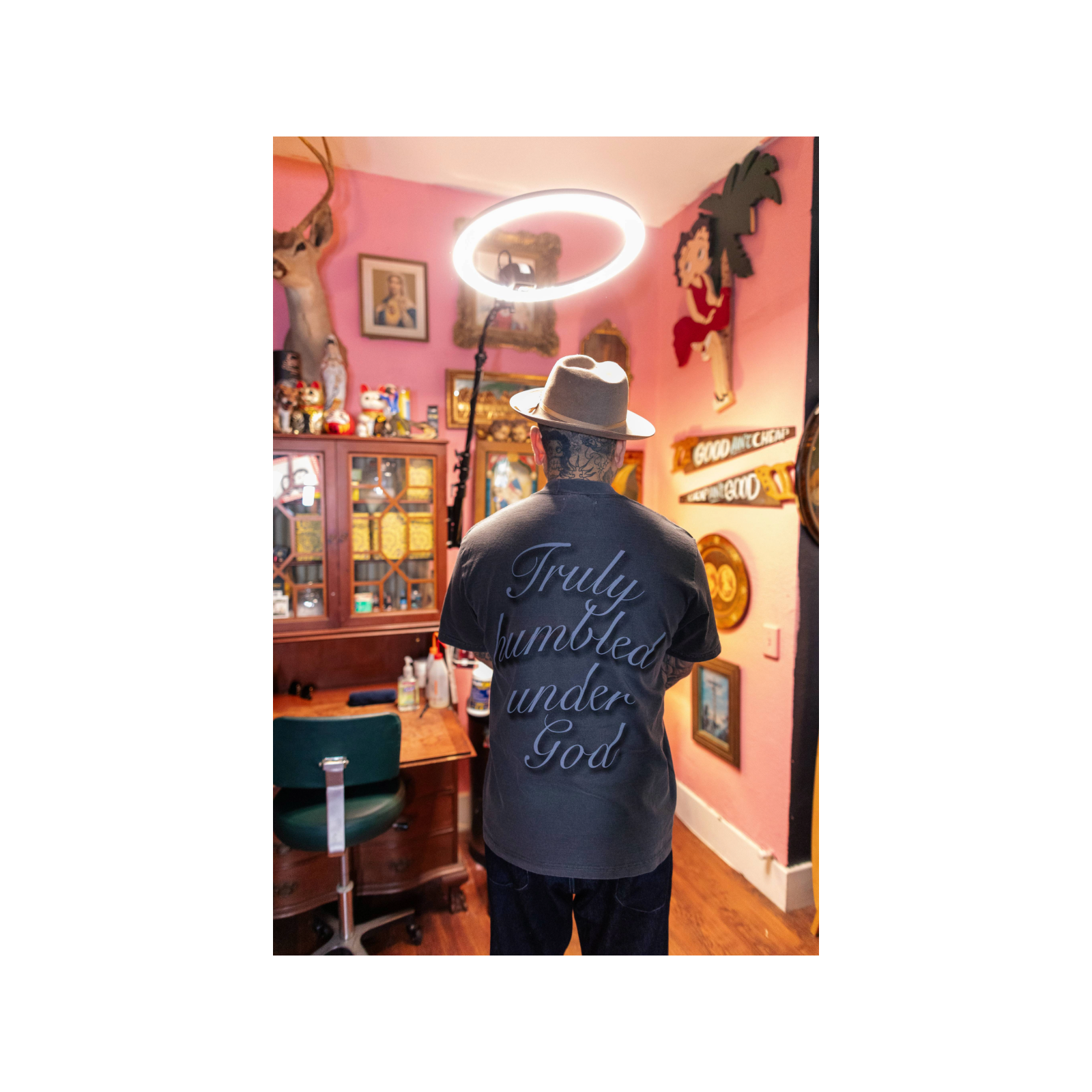 TRULY HUMBLED UNDER GOD shirt, featuring a PATINA Friends & Family embroidery over silk screen. Big back piece print on a relaxed faded grey tee. Add a touch of vintage and style to your wardrobe with this unique and trendy piece. Made for comfort and fashion, perfect for any occasion.